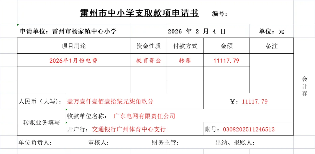 工作温馨提醒:各位校长,从下个学期开始雷州市中小学支取款项申请书统一采用电子版打印。不再采用3联无碳复写单据。